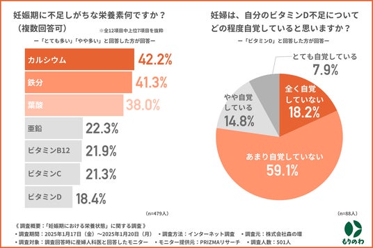 妊婦が不足しがちな栄養素として、カルシウム、鉄分、葉酸、亜鉛、ビタミンB群、ビタミンC、ビタミンDなどがあげられ、特にビタミンDの不足については、妊婦の自覚が低いことも課題として浮き彫りになりました。