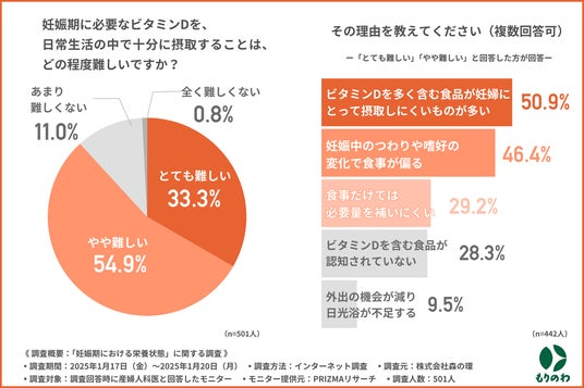 先述の質問に『とても難しい』または『やや難しい』と回答した方に「その理由を教えてください(複数回答可)」と質問したところ、『ビタミンDを多く含む食品が妊婦にとって摂取しにくいものが多い(50.9%)』と回答した方が最も多く、『妊娠中のつわりや嗜好の変化で食事が偏る(46.4%)』『食事だけでは必要量を補いにくい(29.2%)』と続きました。