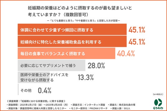 「妊娠期の栄養はどのように摂取するのが最も望ましいと考えていますか?(複数回答可)」と質問したところ、『体調に合わせて少量ずつ頻回に摂取する(45.1%)』と回答した方が最も多く、『妊婦向けに特化した栄養補助食品を利用する(45.1%)』『毎日の食事でバランスよく摂取する(40.4%)』と続きました。