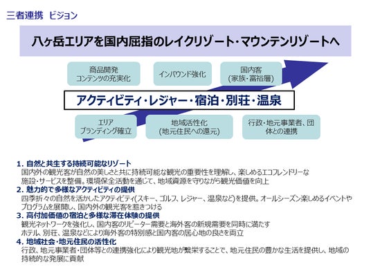 アルピコリゾート&ライフ株式会社、株式会社北八ヶ岳リゾート、株式会社池の平ホテル&リゾーツは、地域資源を活かしたマウンテンリゾート・レイクリゾートの推進に関する包括連携協定を締結しました。