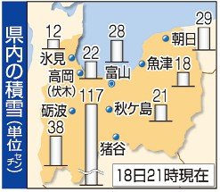 同気象台は、19日午後6時までの24時間に降る雪の量は多い所で平野部30センチ、山間部70センチ、20日同6時までの24時間では平野部30センチ、山間部50センチと予想している。