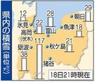 強い冬型の気圧配置となった18日の富山県内は、各地で断続的に雪が降った。富山地方気象台によると、午後9時時点の積雪は砺波38センチ、朝日29センチ、富山28センチなど。路面凍結や降雪の影響でスリップ事故が相次いだ。同気象台は19日にかけて強い寒気が流れ込み、大雪になる恐れがあるとして、交通障害や路面、水道の凍結に注意を呼びかけている。
