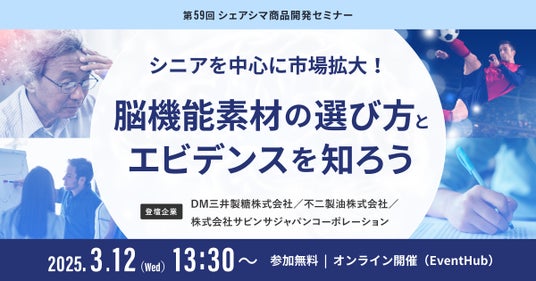 第59回のテーマは「シニアを中心に市場拡大!脳機能素材の選び方とエビデンスを知ろう」です。脳機能を高める素材を取り入れることは、シニア世代の未来のリスク予防だけでなく、記憶力・集中力を高め、働く世代の日々の業務におけるパフォーマンス向上にも繋がります。脳機能素材を活用した商品開発における新たな視点を得たい方に最適なセミナーです。リアルタイムで質問できるQ&Aコーナーもございます。疑問や課題を直接解消できる絶好の機会です。ぜひこの機会に、商品開発の新たな可能性を探ってみませんか?
