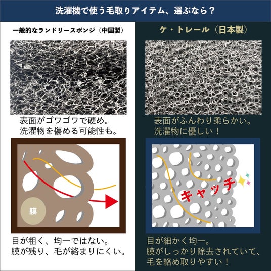 「ケ・トレール」は、工業用フィルター等で使用される業務用の高品質ウレタンを活用した毛取りアイテムです。ウレタンの骨格が均一で目が細かいため、毛やホコリを効率よくキャッチ。さらに、洗濯物と一緒に投入するだけで、衣類の間を動き回りながら浮いた毛を絡め取ることができます。