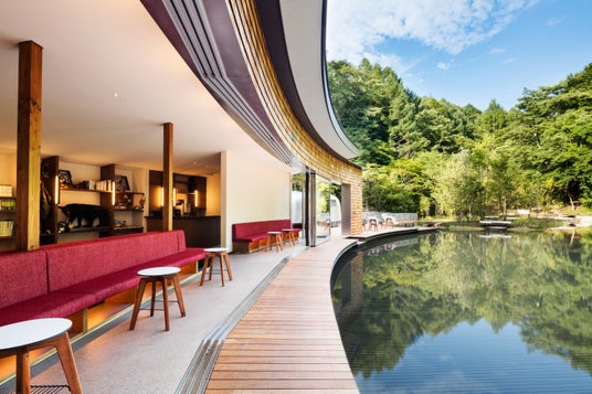 軽井沢星野エリア内にある、源泉かけ流しの立ち寄り湯です。肩まで浸かれる深い湯船の内湯と解放感たっぷりの露天風呂、ジャズの流れるサウナや水風呂を備えています。湯船には星野温泉の源泉が良質なまま溢れ、その軟らかいお湯は「美肌の湯」といわれています。