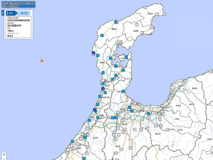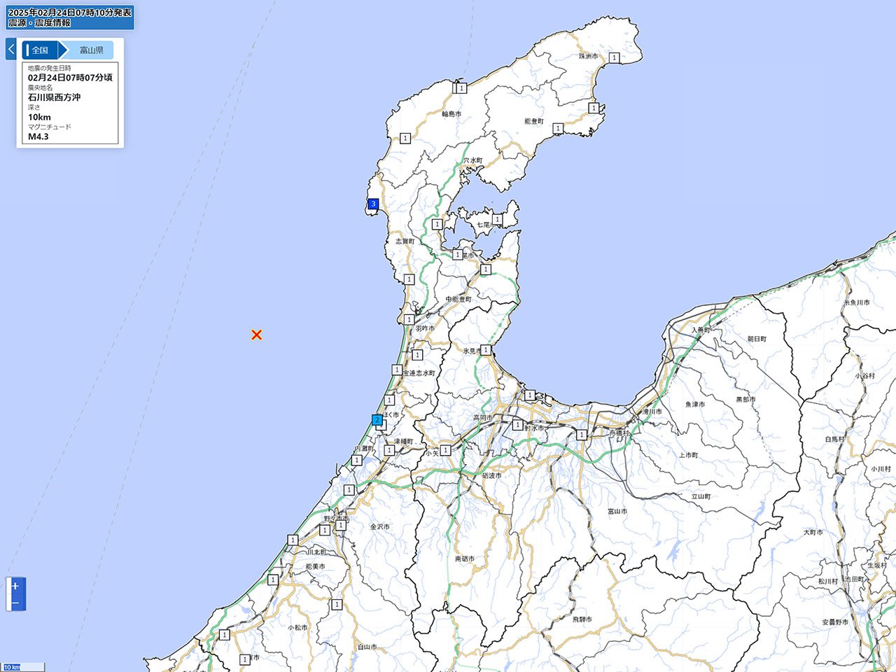 24日午前4時9分ごろ、石川県で震度3の地震があり、富山県内では最大で震度2を観測した。気象庁によると、震源地は石川県西方沖で、震源の深さは約10キロ。地震の規模はマグニチュード(M)4・9と推定される。午前7時7分ごろにも石川県で震度3の地震があった。