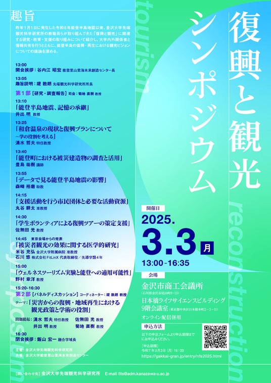 このたび、金沢大学先端観光科学研究所は、「復興と観光」をテーマとしたシンポジウムを金沢・東京で同時開催し、観光の視点で、令和6年能登半島地震からの復興の在り方について考えます。