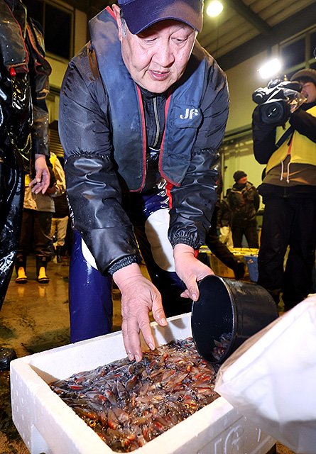 冷たい風が吹く午前3時40分ごろ、滑川春網定置漁業組合が親船と子船計6隻で滑川漁港を出港し、沖合約1・5キロの漁場に向かった。定置網には多くのマイワシがかかっており、漁師がかき分けながらホタルイカをたも網ですくった。ざるに入れると、幻想的な青白い光を放った。