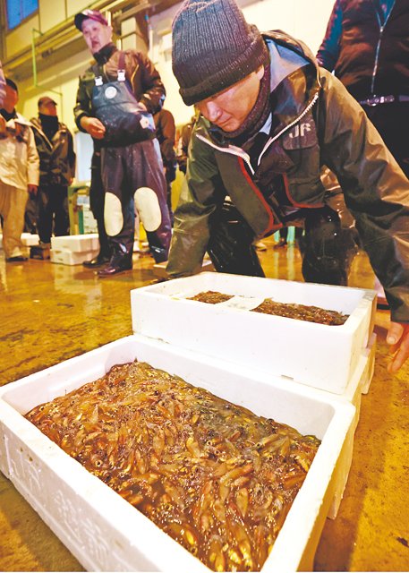 ホタルイカは市内の水産加工会社が1キロ当たり1万8900円で競り落とした。漁は例年、6月ごろまで行われ、4月から最盛期を迎える。