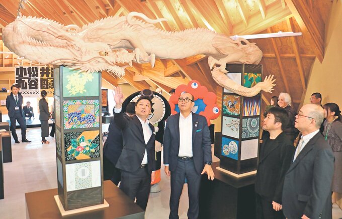 井波彫刻協同組合の花嶋弘一理事長は「焼き物と木彫りで、最初は接点を見つけにくかったが、話し合う中で互いの強みを生かせるようになった」と振り返る。小松九谷工業協同組合の宮本雅夫理事長も「小松九谷の個性や多様性が伝わる門柱に竜が乗ることで、圧倒的な存在感が出る」と語った。