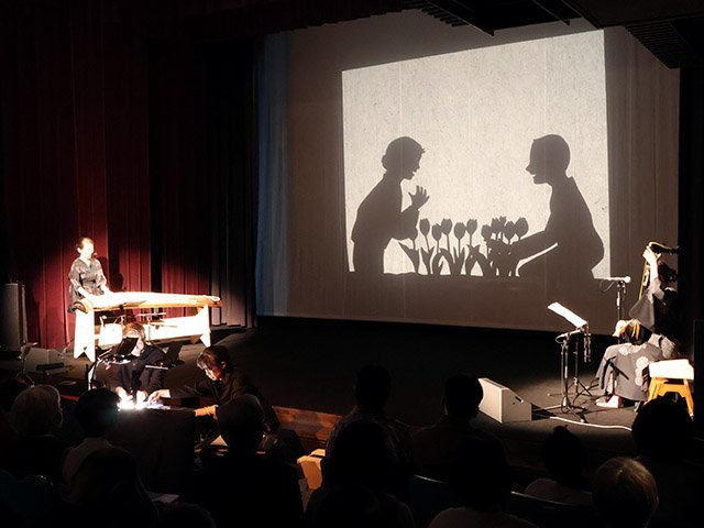 2人と琵琶奏者の坂田美子さん(千葉)、箏(こと)奏者の稲葉美和さん(東京)でつくる演奏グループ「KAGEN」が上演した。水野の生涯が幽玄な音楽とともに巧みな影絵で表され、来場した約100人が見入っていた。劇に先立ち、影絵体験もあった。