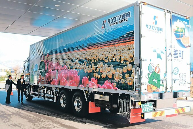 町は「ラッピング等車両補助金」を設け、県外に行く町内事業者の車両に町の情報を記載した広告を施す費用を補助している。同社が補助を受けるのは2台目で、今回は10トントラックの各側面、背面に「にゅうぜんフラワーロード」「洋上風力発電」「ジャンボ西瓜(すいか)」などをデザインした。