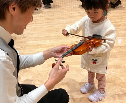 バイオリンはマンツーマンで体験できるコーナーが好評、我が子の隠れた才能を発見できるかも?!