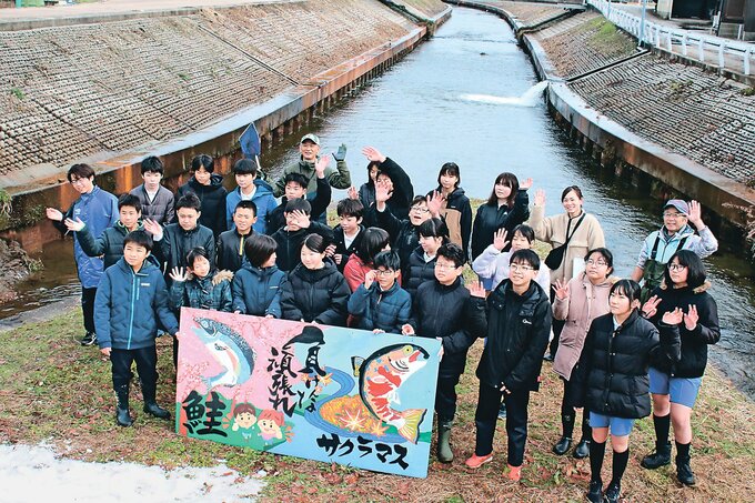 富山県舟橋村の舟橋小学校の6年生が4日、卵から育てたサケとサクラマスの稚魚を村内を流れる細川と京坪川の合流地点で放流し「大きくなって戻ってきてね」と成長を願った。
