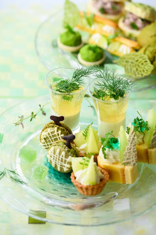 ティースタンドには、10種類のスイーツが並びます。口当たりのよいパンナコッタに瑞々しいメロンのジュレと、爽やかなディルを合わせてさっぱりと仕上げたグラスパフェや、フレッシュなメロンに上品でスパイシーな風味が魅力のタラゴンを合わせ、大人っぽい味わいに仕上げたエクレア。そしてコク深いチョコレートの味わいとミントの清涼感の絶妙なバランスがクセになるチョコミントメロンパンなど、ハーブの香りと食材の相性にもこだわりました。他にもよもぎを練り込んだサクサクのスコーンや、スパイシーで爽やかな香りの木の芽をアクセントにしたメロンタルトなど、和ハーブを取り入れたメニューも魅力です。