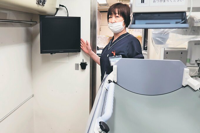 新たにモニター2枚を壁と天井に配置。受診者がバリウムを飲む時や体の向きを変える際、音声以外に8カ国語の文字表示と手話で伝えられるようになった。放射線技師の河尻洋子さんは「バリウムを飲む時、げっぷをしてはいけないが、外国人にうまく伝わらなかった。より正確に案内できると思う」と話した。