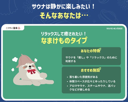 簡単な質問に答えると、あなたのサウナタイプとおすすめの施設を紹介する「おすすめサウナ診断」も同時公開。診断結果をシェアすると、電子マネーが当たるキャンペーンも開催中です。