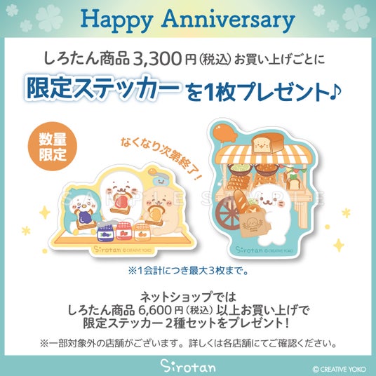 ※オンラインショップでは6,600円(税込)お買い上げの方に、「しろたん限定ステッカー」2種セットをプレゼントします。