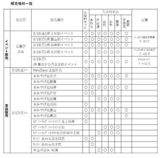 この度、周年を記念するとともに、北陸新幹線には、「○○温泉」と名の付く駅が3つもあることに着目し、各温泉関連団体・各自治体の協力のもと、 「北陸新幹線には温泉がある(HOKURIKUSHINKANSENにはONSENがある)」をテーマに温泉地の魅力を楽しめる特別な「入浴料」を発売します。