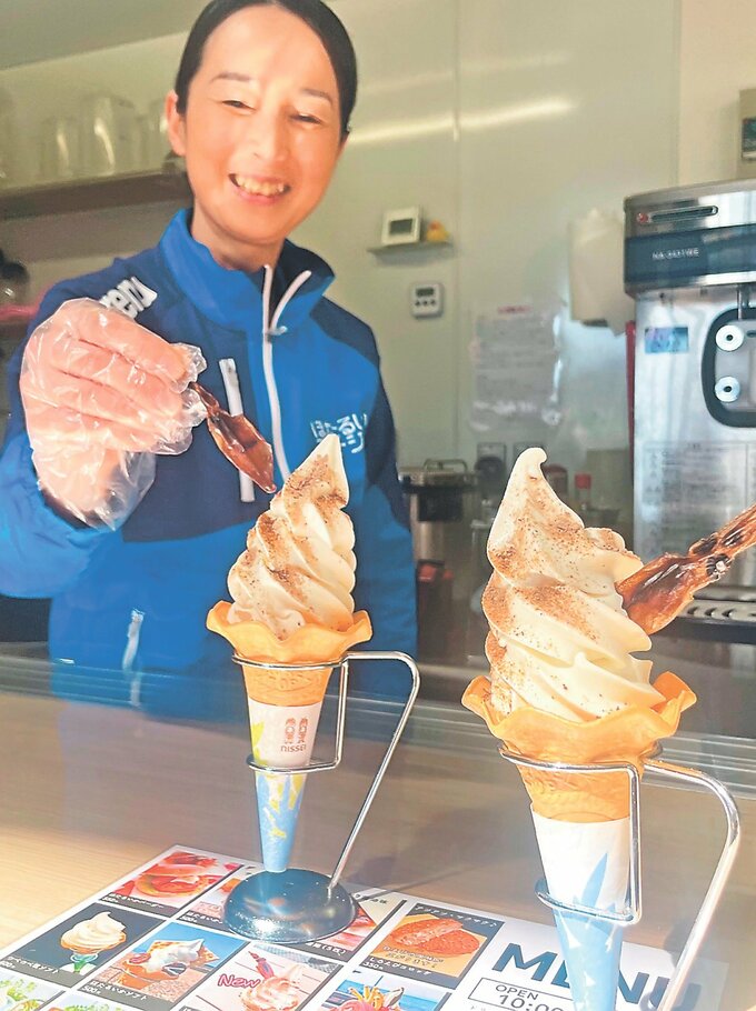 ふりかけソフトを提案したスタッフの油本智美さん(50)は「デザートとしてホタルイカを食べ、楽しんでほしい」と話している。「ほたるいかソフト」「ほたるいかふりかけソフト」ともに500円。