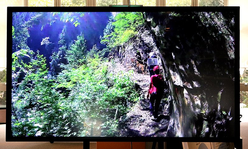 VR映像(約14分)は13歳以上が対象。ゴーグル型の端末を着けると360度見渡せる映像が広がる。ガイドの案内で下ノ廊下を歩く内容になっており、狭い所で幅50センチほどの「水平歩道」や、左右の沢から水が勢いよく流れ込む「十字峡」など、険しい地形を目の前に感じられる。このほか、常設の大型モニターでも下ノ廊下の紹介映像(約8分)を見られる。