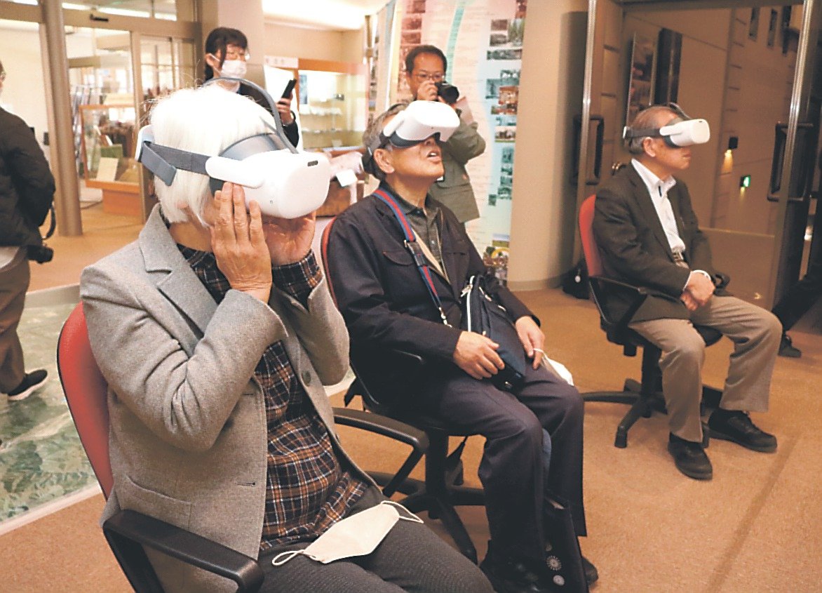発表会では、同館の運営委員らが映像を体験した。飯村滋委員長は「素晴らしい景色が見られた。リアルで、下を見たら怖いぐらいだった」と話した。