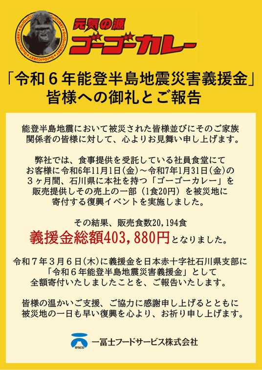 本イベントでは、令和6年11月1日~令和7年1月31日の期間にお客様へゴーゴーカレーを販売提供し、その売上の一部を日本赤十字社 石川県支部に義援金として寄付いたしました。