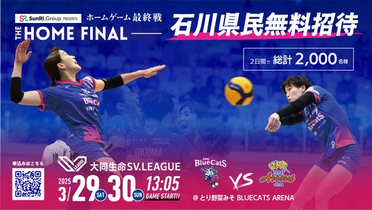 3月29日、30日にかほく市で開催いたします、サンリーグループ PRESENTS MATCH ホーム最終戦 THE HOME FINAL「石川県民無料招待」とし、石川県民1,000名様 総計2,000名様を無料招待(2F 自由席)いたします!