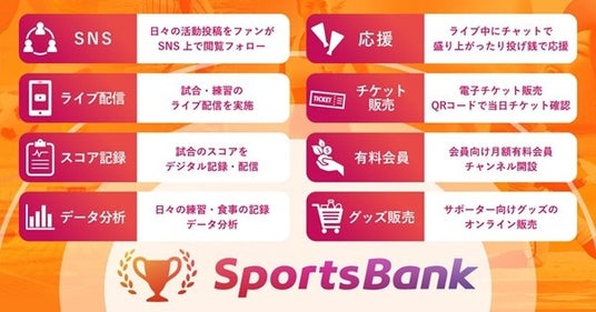 情報発信やライブ配信といったSNS機能に始まり、試合やトレーニングに特化したスコア記録やヘルスケア機能、新たな収益を生み出す有料会員機能、チケット販売機能などスポーツライフを支える多種多様な機能を通じてスポーツに関わるすべての人々を応援します。