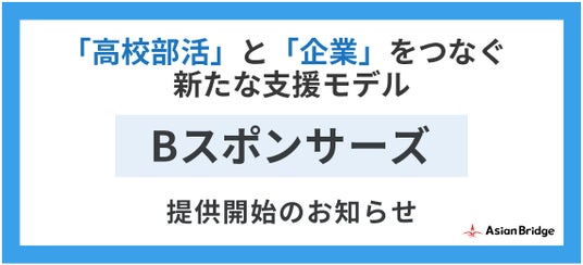 スマートフォンアプリケーション開発関連事業およびWebシステム開発関連事業を手掛ける株式会社Asian Bridge(本社:東京都港区、代表取締役社長:小西 広恭、以下「Asian Bridge」)は、人材総合サービス会社の株式会社ネオキャリア(本社:東京都新宿区 代表取締役CEO:西澤 亮一、以下「ネオキャリア」)と協業し、高校の部活と企業をつなぐ新たな支援モデル「Bスポンサーズ」の提供を開始いたします。