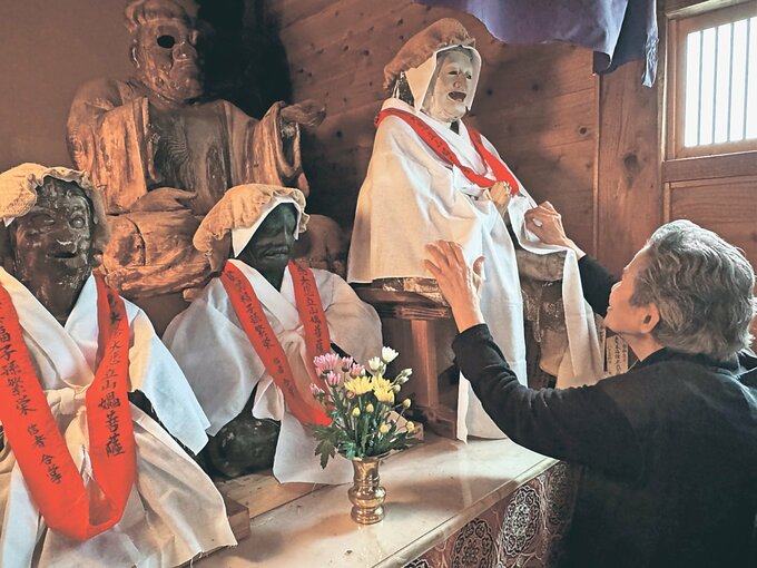 立山信仰の伝統行事「おんば様のお召し替え」が13日、富山県立山町芦峅寺の閻魔(えんま)堂であり、地元の女性たちが、山の神として親しんでいるうば尊(おんば様)の木像の白装束を着せ替えた。