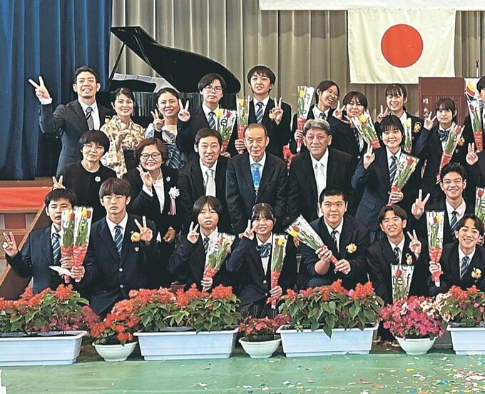 7日は大居さんと協会理事の谷俊介さん(44)=高岡市=が出席した。花束を手渡し、卒業生39人と記念写真に納まった。垣花秀明校長は式辞で大居さんらを紹介し、感謝することの大切さに触れた。
