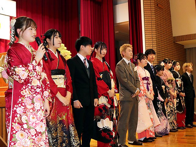 恒例の「二十歳の抱負」では、33人全員が近況や目標を語り、医師や助産師、システムエンジニアといった目標に向かって取り組んでいることなどを発表した。式典後、越中舟橋ばんどり太鼓振興会が祝い太鼓を演奏した。