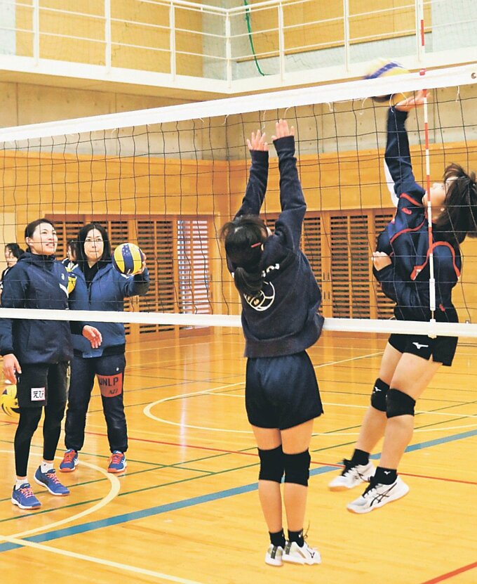 同市の西條、北部、南部の3校の女子バレー部の生徒ら約30人が参加。生徒たちは会場の同市朝日丘小学校体育館に集まり、櫻井さんや福山さんからアドバイスを受けながら、基礎から応用までみっちり練習し、実戦形式のゲームで汗を流した。