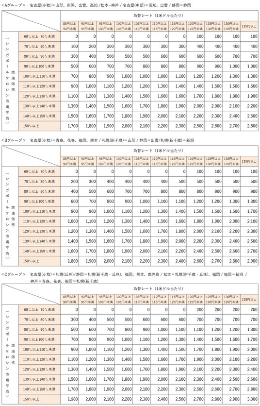 なお、燃油特別付加運賃は、シンガポールケロシン市況価格および為替レートの変動に応じて、 1ヶ月毎に見直しております。