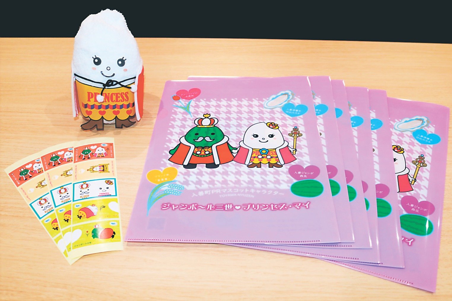 富山県入善町のPRマスコットキャラクターに「プリンセス・マイ」が仲間入りした。入善ジャンボ西瓜(すいか)をイメージした「ジャンボ~ル三世」の“花嫁”と位置付け、町内の小学生が「お米」をモチーフに考案したデザインと名称を採用した。新しいグッズが完成し、「スイカの王様」と「コメのお姫様」のカップルで広報活動を展開する。