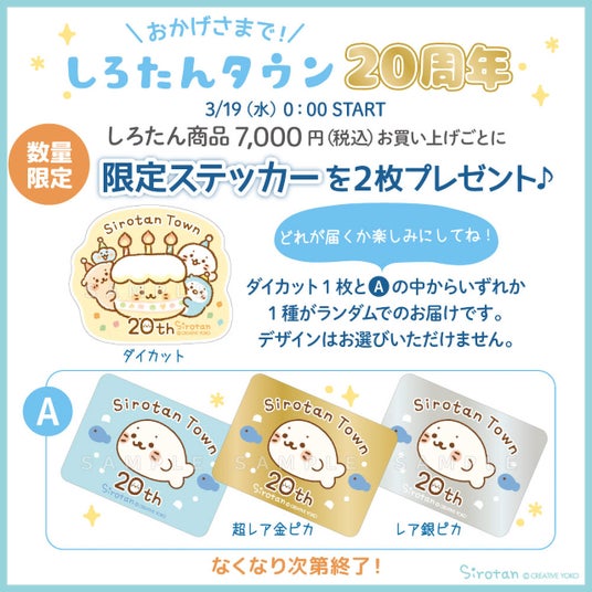 株式会社クリエイティブヨーコ(本社:長野県長野市 代表取締役社長:北原 武幸)は、『しろたん』唯一の専門オンラインショップ「楽天しろたんタウン」の出店20周年を記念し、2025年3月19日(水)から3月31日(月)までの期間、記念フェアを開催します。