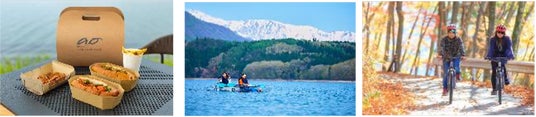 「ao LAKESIDE CAFE」では、近隣のライオンアドベンチャーやMauka outdoorと連携し、SUPやクリアカヤックなどの湖上アクティビティとランチ・カフェメニューをセットでお楽しみいただけるプランをご用意しています。また、大町市観光協会ともタイアップしサイクルスタンドやウォーターサーバーを設置。シェアサイクルのサイクルステーションとして、一周6.5km程度の青木湖周遊や、近隣に足を伸ばしての観光など、サイクリングを楽しむ方の利便性を高めています。アクティビティ体験後にもぜひ「Hakuba Zekkei Sauna “ao”」をお楽しみください。