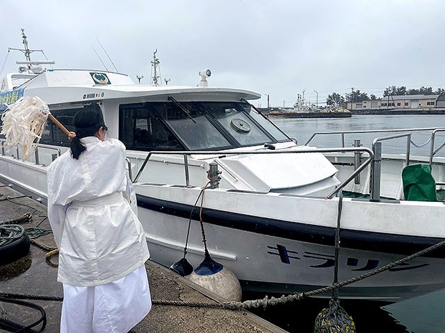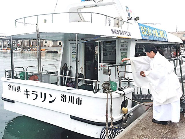 4月1日に今シーズンの運航がスタートする「ほたるいか海上観光」に向け、富山県滑川市の観光遊覧船「キラリン」の安全祈願祭が19日、滑川漁港に停留しているキラリンの船内で行われた。観光や漁業、行政の関係者ら約15人が出席。地元の櫟原(いちはら)神社の神職が祝詞を奏上し、水野達夫市長ら出席者が順に玉串をささげた。
