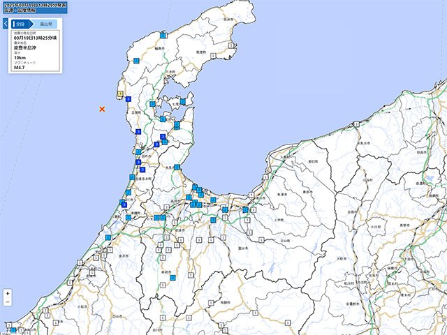 19日午後1時25分ごろ、石川県志賀町で震度4の地震があった。富山県内は富山、高岡、氷見、小矢部、南砺、射水、舟橋の7市村で震度2を記録した。気象庁によると、震源地は能登半島沖で、震源の深さは約10キロ。地震の規模はマグニチュード(M)4・7と推定される。津波の心配はない。