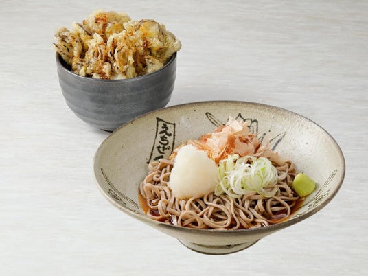 また、福井県大野市で栽培される力強い香りと歯ごたえが特徴の「九頭竜まいたけ」を贅沢に使用した「ミニ九頭竜まいたけ天丼」とおろしそばのセットは店舗イチオシメニューです。