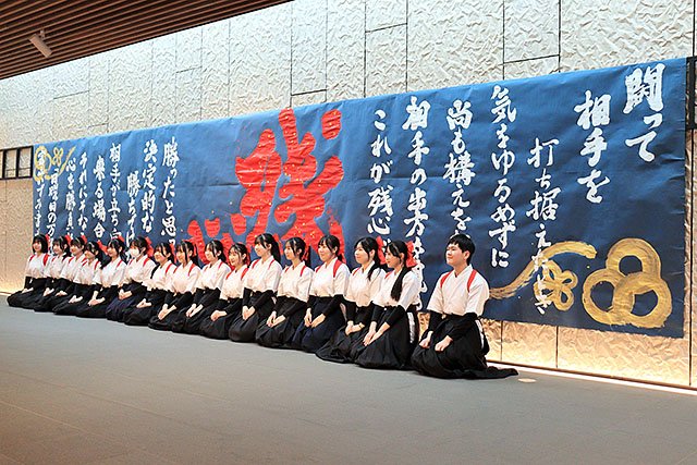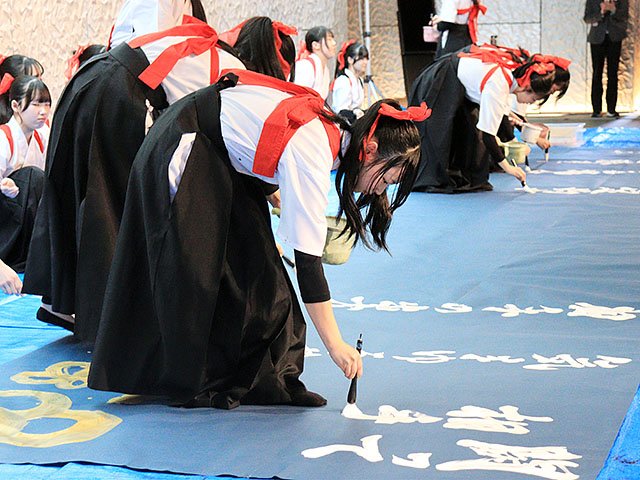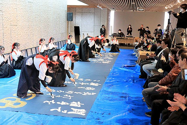 1、2年生の17人がはかま姿で登場。池波さんのエッセー「日曜日の万年筆」の一節を揮毫(きごう)した。題材に選んだ言葉は、部員が池波作品を読み、話し合って決めた。保護者らが見守る中、力強く筆を走らせ、大きな拍手が送られた。会期は29日~6月9日。書道パフォーマンスの作品は同館エントランスに飾られている。北日本新聞社共催。