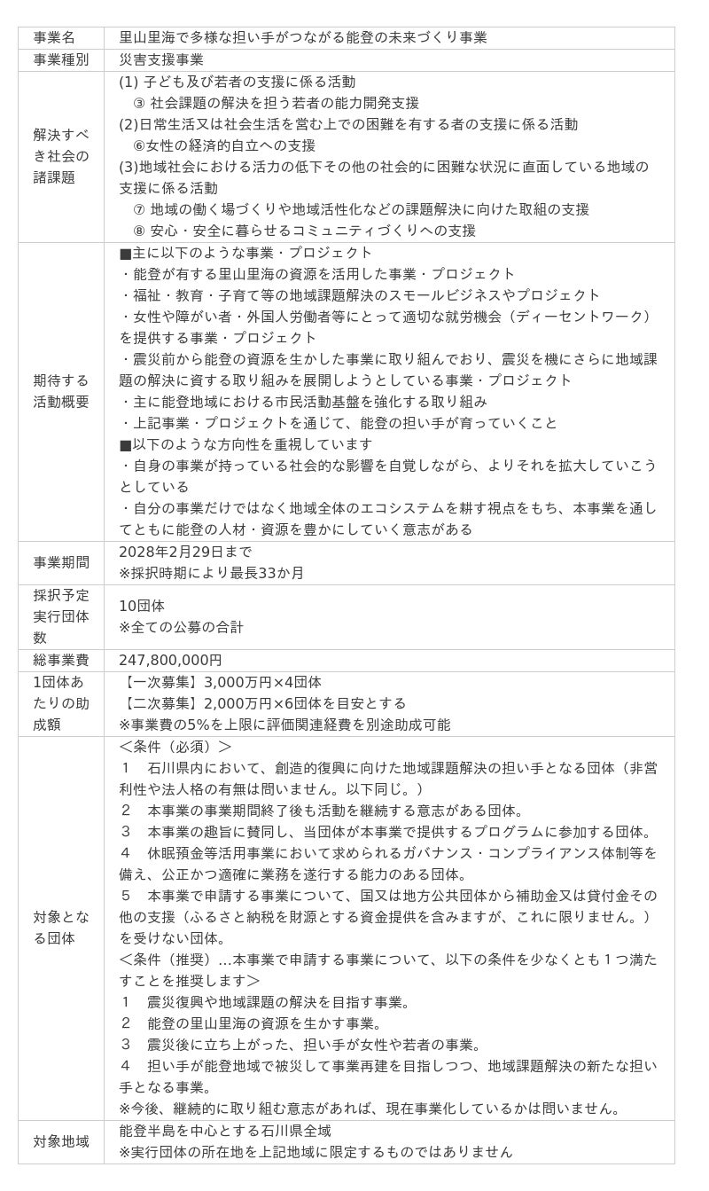 公益財団法人ほくりくみらい基金(所在地:石川県金沢市、代表理事:永井三岐子)は休眠預金等活用事業「里山里海で多様な担い手がつながる能登の未来づくり事業」の公募情報を公開しました。