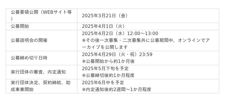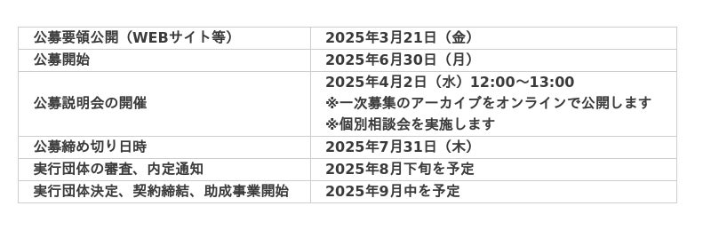 公募は2025年度中、2回に分けて実施する予定です。ただし、契約開始時期にかかわらず、事業終了時期は変わりません。
