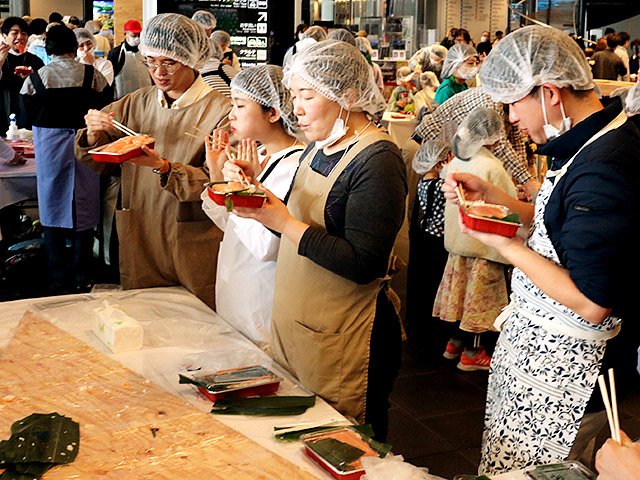 ますずしは酢飯約100キロ、マス約50キロ、ササ約900枚を使用。参加者は12グループに分かれ、富山ます寿し協同組合に加盟する職人の指導を受けながら、約1時間かけて三角形の木枠に材料を敷き詰めた。ふたをして約20分間押し、最後に12個を円形に組み合わせると拍手が起こった。