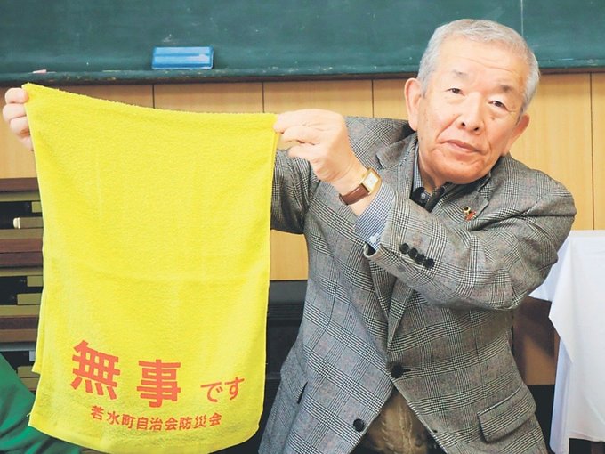富山県高岡市佐野若水町自治会(橋場憲夫会長)は、災害時に無事であることを示す黄色のタオルを作った。23日は同市の若水町公民館で総会があり、住民にお披露目した。
