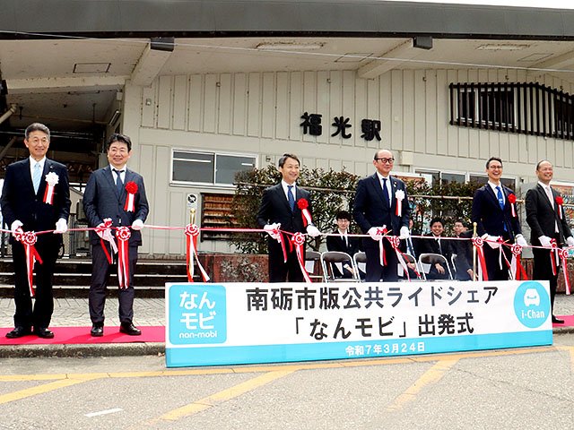 南砺市は24日、市内のタクシー会社5社との共同で公共ライドシェア「なんモビ」の本格運行を始めた。タクシーを優先的に配車し、タクシー会社と共存しながら住民やビジネス・観光客の移動の足を確保する。国の制度に基づいた自治体とタクシー会社による共同運行は全国で初めて。同日はJR福光駅前で出発式を行い、関係者が全国のモデルとなる取り組みに期待を寄せた。(中田真紀)