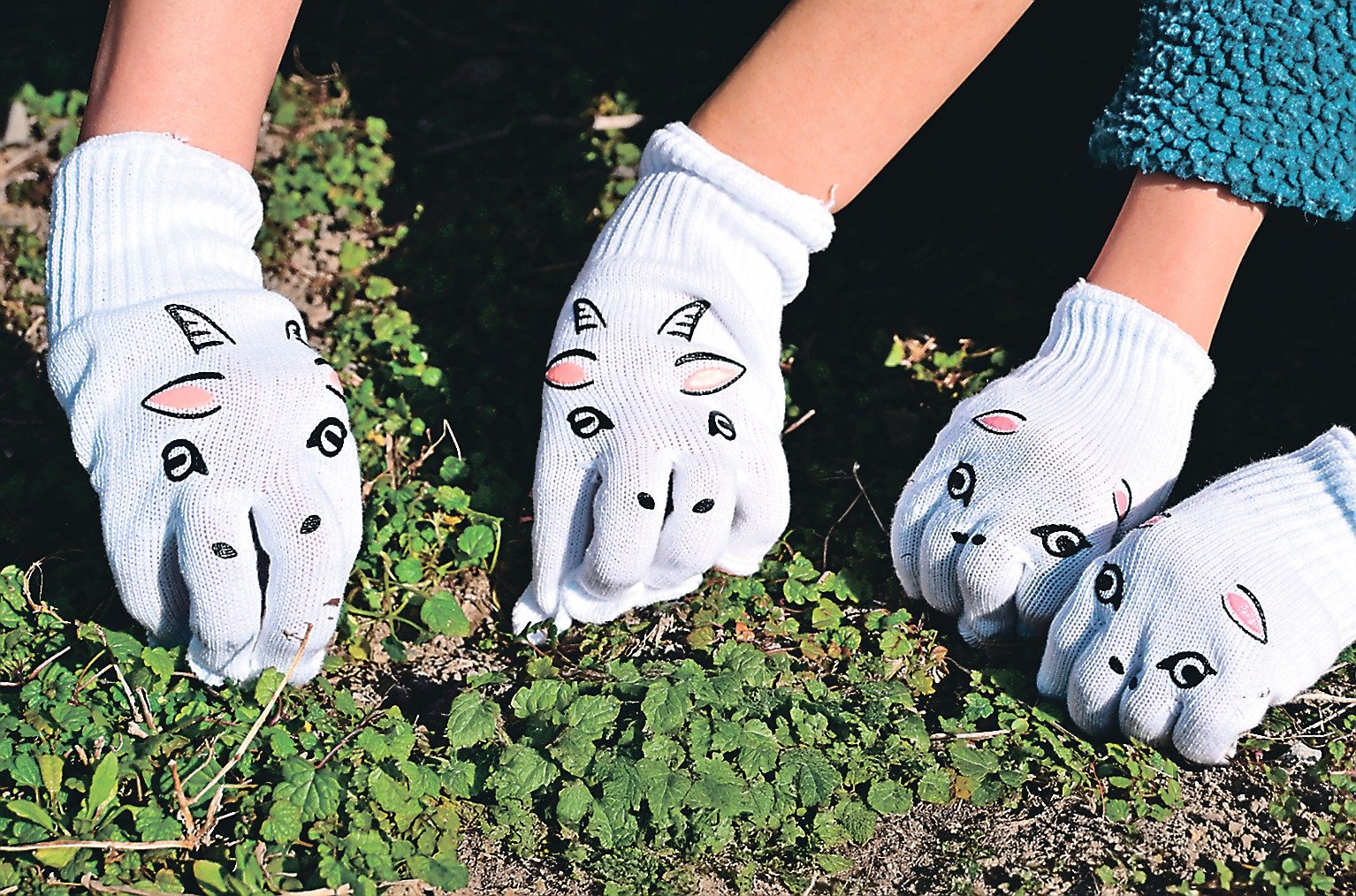 人の手の形に添うデザインで、綿素材の軍手に塩化ビニール樹脂で顔を描き、ピンクやベージュで滑り止めを付けた。