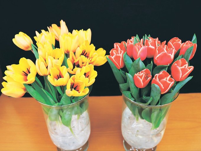 富山県が育てたチューリップの新品種「春のあかり」と「春のサンタ」が27日、お目見えした。春のあかりはだいだい色の花が街灯の光のように、春のサンタは赤色に白縁の花びらがサンタクロースの衣装のように見えることから名付けた。4月22日に始まるとなみチューリップフェアの会場で展示し、予約販売も受け付ける。