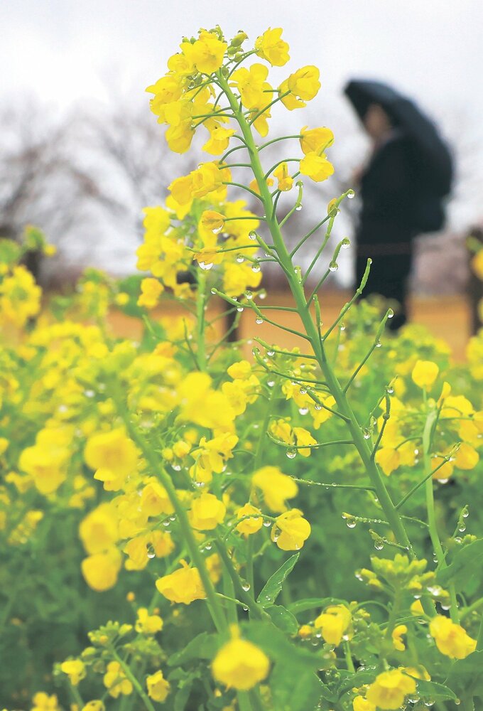 富山市北代の呉羽山公園都市緑化植物園では28日、見頃を迎えた菜の花が霧雨にぬれ、みずみずしく咲いていた。花弁に雨粒が光り、周囲に甘い香りも漂っていた。